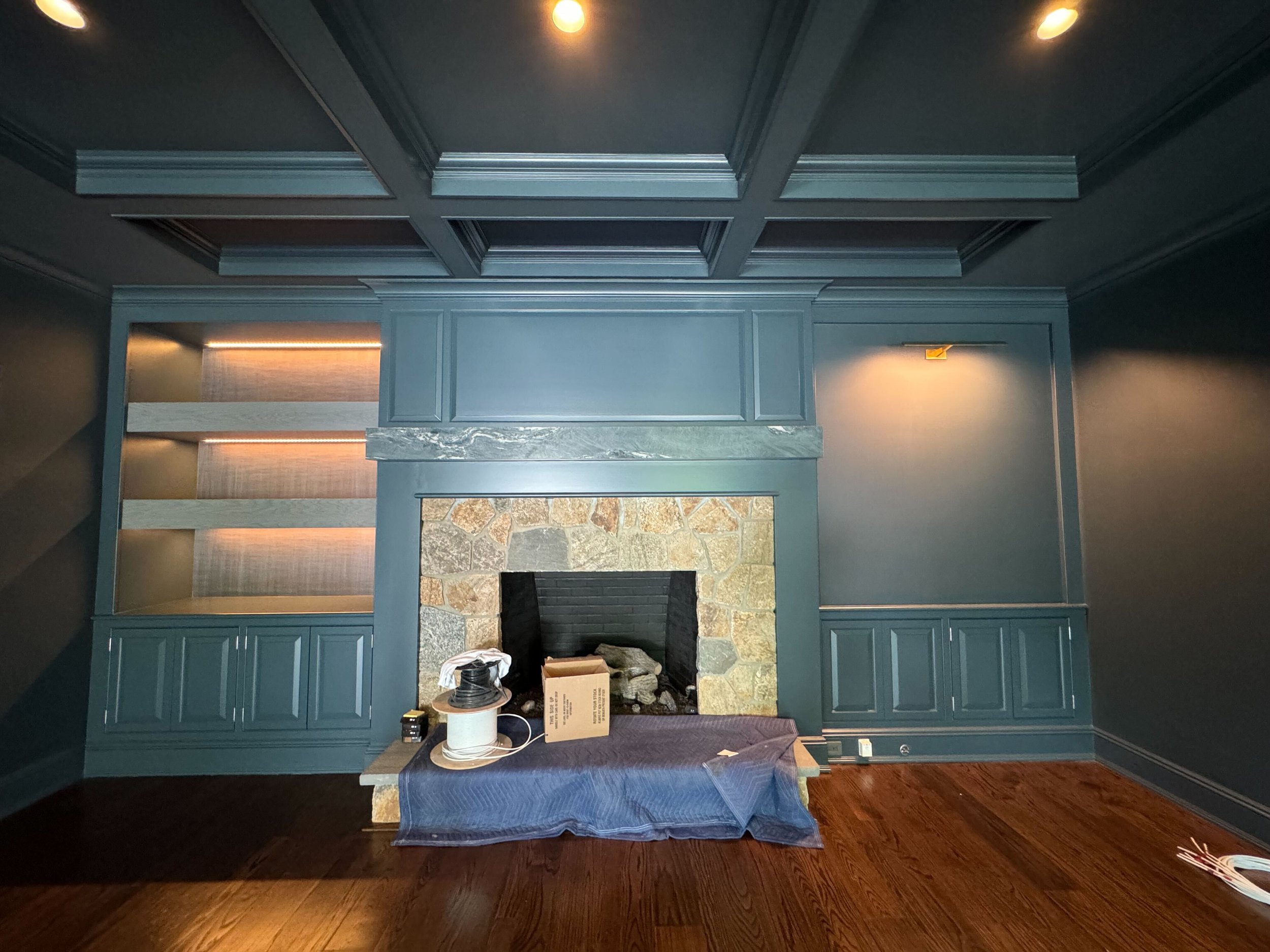 Custom bookshelf for another project in New Canaan, CT - We added some sconces to illuminate painting that will be placed on the wall, recessed lighting, custom colored Lutron outlets with screw-less places and finally LED tape lighting recessed into the shelves which required a lot of coordination between us and the custom cabinet makers.